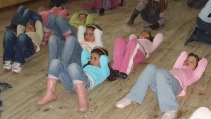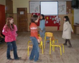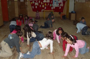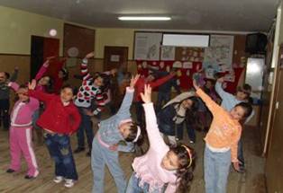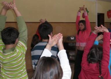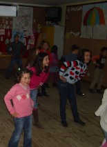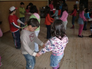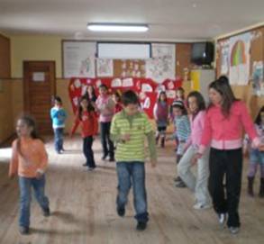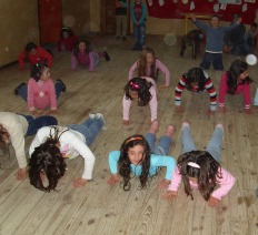 Ginástica Rítmica : Esta actividade pretendia aliar duas vertentes a ginástica e o jogo. Assim, ao longo desta as crianças foram convidadas a tirar uma de cada vez um papelinho à sorte o qual dizia o que todas em conjunto deveriam fazer, por exemplo: 10 flexões ; saltar 15 vezes; entre outros. Isto sempre ao som de músicas bastantes ritmadas, escolhidas pelas crianças.