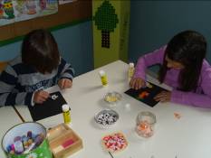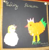 - Com pequenos pedaços de papel de lustro de várias cores cada criança fez um desenho sobre a Páscoa.
