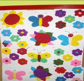 - Fizemos em cartolina alguns desenhos alusivos à Primavera, que foram “cobertos” com pequenas bolas feitas pelas crianças em papel crepe de diversas cores, e aplicadas com cola, de modo a cobrir todo o desenho. Criando assim o nosso painel de Primavera.