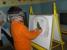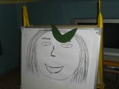 - A brincadeira do Bigode : - fizemos o desenho de uma cara e as crianças de olhos vendados, tinham que tentar colar o bigode na posição correcta no rosto desenhado. Quem chegasse mais perto ganhava.
