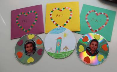 - As crianças elaboraram uma bonita prenda para oferecer ao seu pai, recorrendo a material de desperdício (cd´s inutilizados e restos de cartolinas).