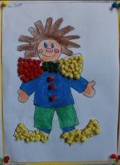 - Cada criança decorou o seu palhaço recorrendo a restos de papel creme, fazendo pequenas bolas que foram colodas nos sapatos e laço do palhaço de Carnaval.